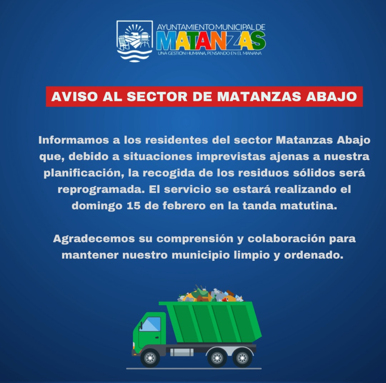 Agradecemos la colaboración de cada uno de ustedes sacando los residuos sólidos el domingo 15 de febrero para su recogida y evitar inconvenientes.